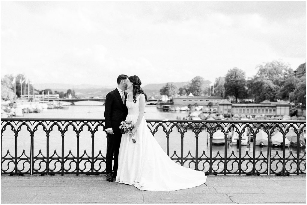Für das Brautpaarshooting bewegten wir uns entlang der Münsterbrücke zum Haus zum Rüden. Der grosse Vorteil von einer zentral gelegenen Hochzeitsfeier? In unmittelbarer Nähe hat Zürich unzählige, tolle Kulisse zu bieten. Mit dem Münster oder der Frauenkirche im Hintergrund sowie mit Blick von der Münsterbrücke auf die Limmat bietet die Stadt eine wunderschöne, bedeutsame Fotoshootingkulissen. Sie sind schnell erreichbar und so entstehen einfach mehr Fotos, selbst in kurzer Zeit!